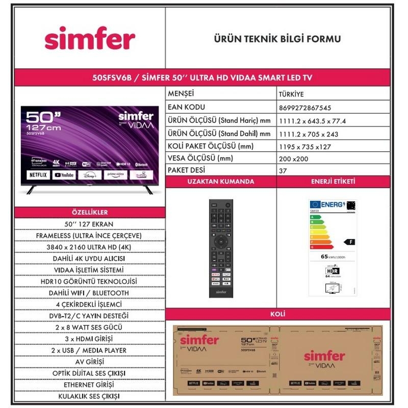 SİMFER 50SFSV6B 50'' ( 127 EKRAN ) 4K VİDAA SMART ÇERÇEVESİZ TV